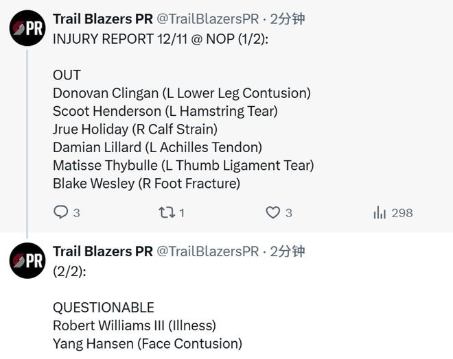 北京时间12月11日,开拓者官方更新了明日对阵鹈鹕的伤病报告,杨瀚森因面部挫伤被列为出战成疑(上场可能50%)。